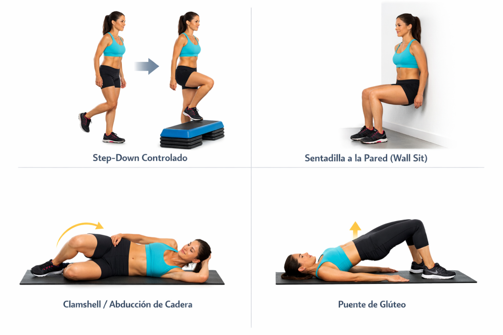 - Puente de glúteo: cadera fuerte = rodilla más estable.